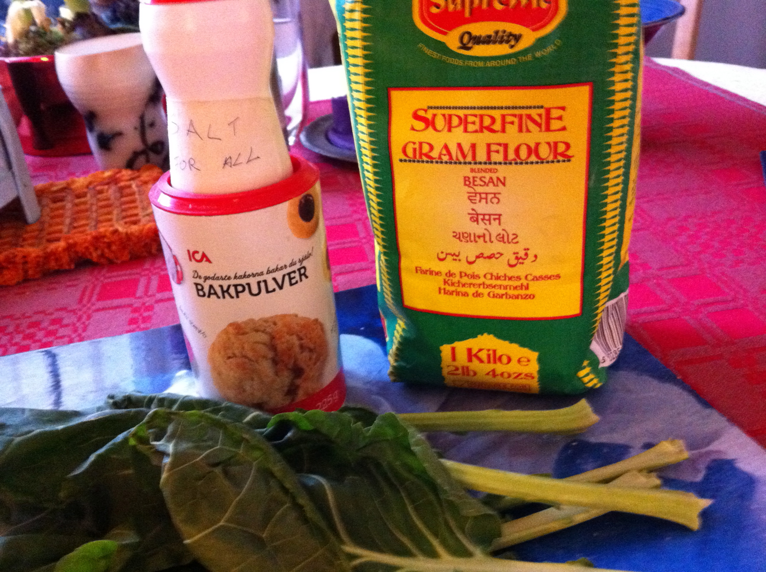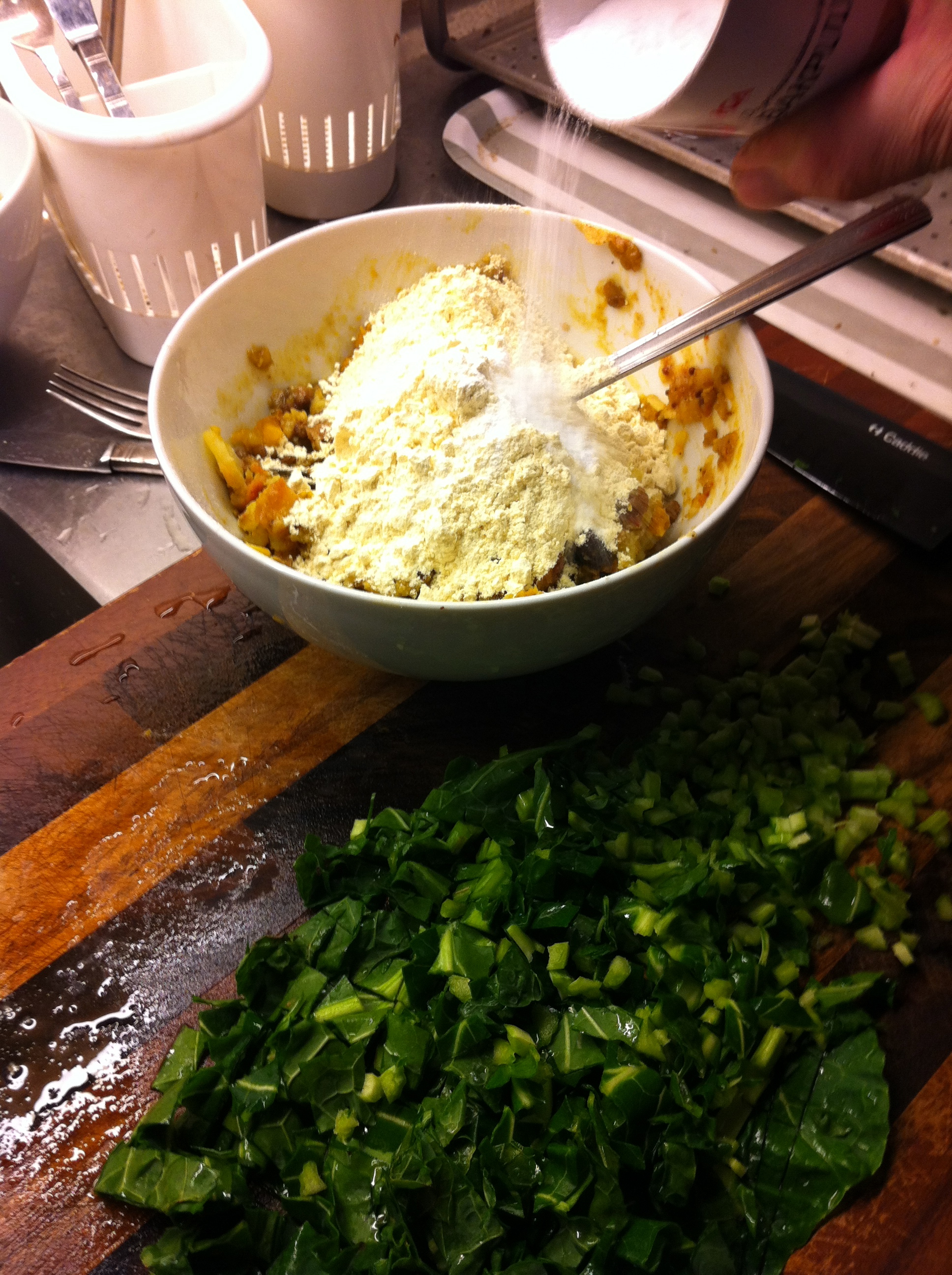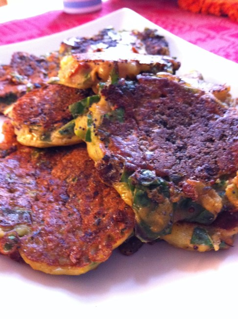 Dagens otroligt goda plättar innehöll hackade gröna blad från kålgården, gårdagens rester -och kikärtsmjöl.