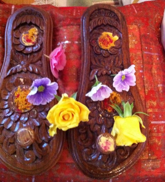 Inget konstigt egentligen. Man lägger händerna på, och huvudet emot ,Padukas. Symbolen för Guds Fötter…
