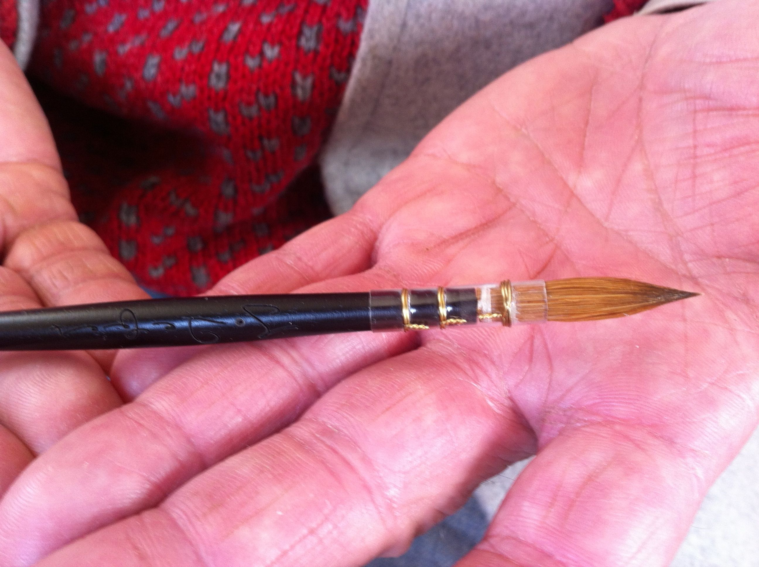 Detta är en Baby. Vi hittade den i konstbutiken i Linköping. Special Eddition.  Kolinski mårdhår, ebenholts skaft med gåspenneinfattning.Tillverkad i begränsad upplaga vid ett jubileum i den tyska fabriken (Da vinci). Hi,hi, direktörens namnteckning är ingraverad i skaftet !