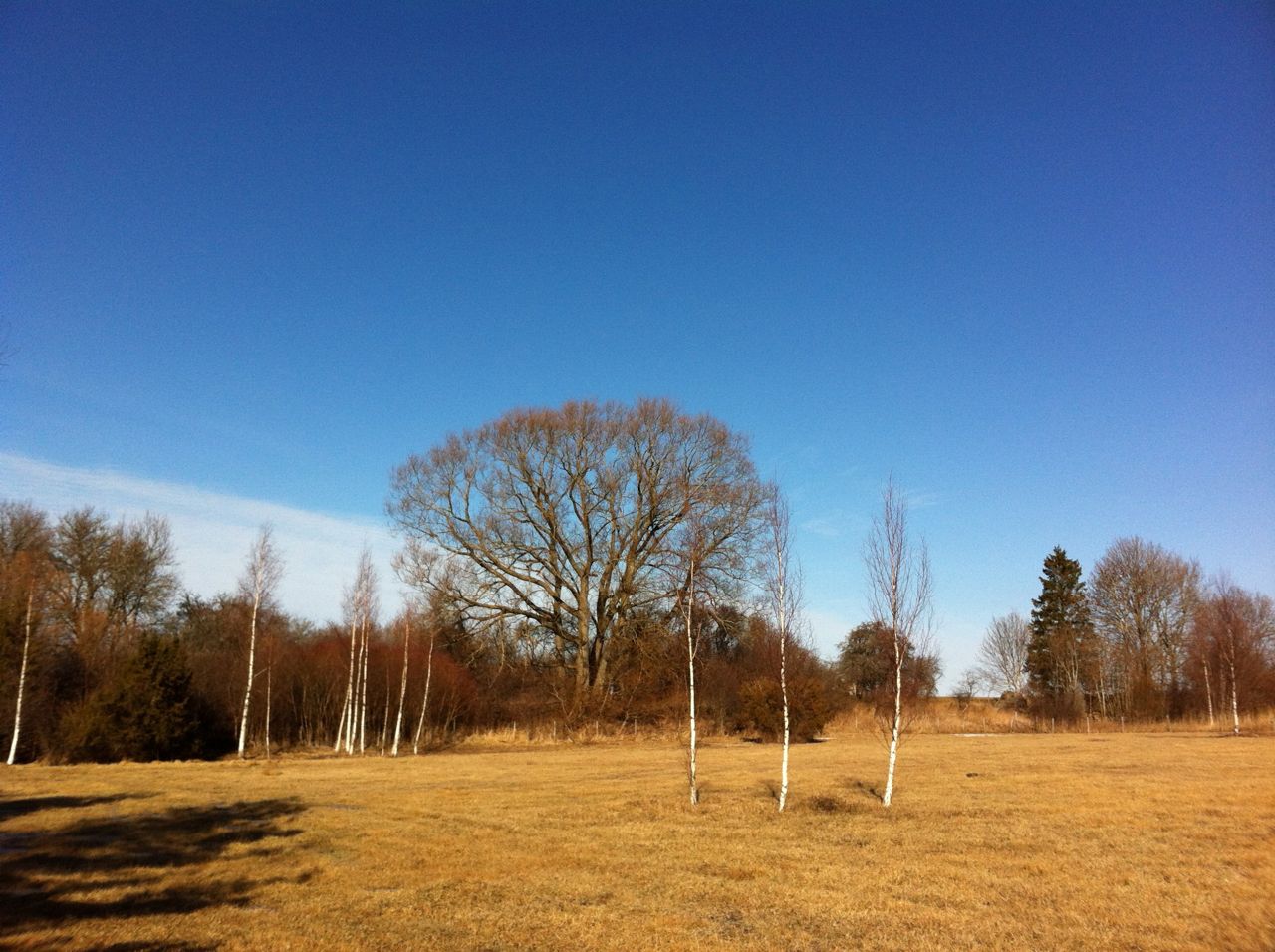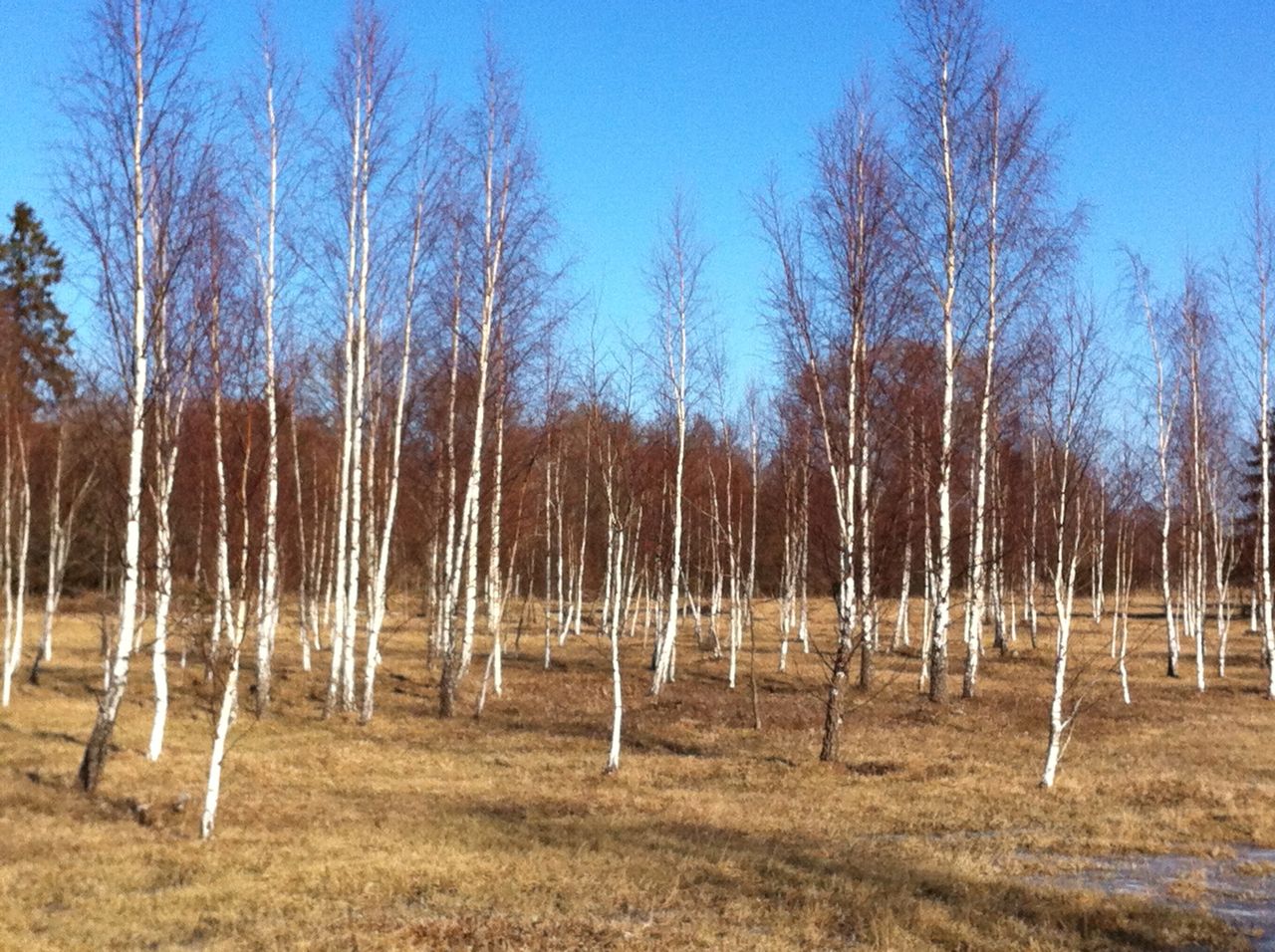 Mellan vinter och vår. Inget grönt, bara om man tittar noga. Björkarna står i sällsam ensamhet och är bara vackra! De må se sovande ut men därinnanför porlar saven.