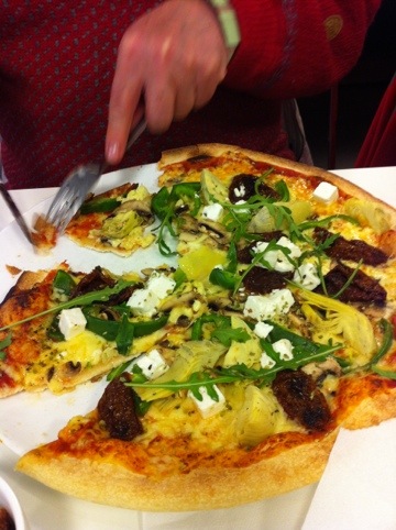 men Rurik har gift sej med en hungrig dam, så när vi packat klart blev det middag. Jag äter varken ost eller mjöl så jag tittar på Ruriks pizza. Min Wok är god men jag tittar lystet på pizzan i alla fall. Nog har dom lyckats göra den vacker?