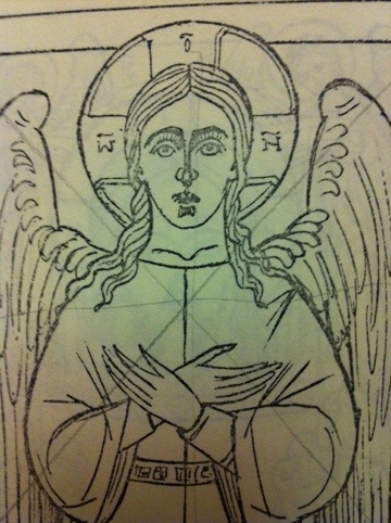 Det här är Fader Roberts teckning av Stora Tystnadens Ängel,Kristus glorian känns igen på de dubbla linjerna och de linjer i själva glorian som symboliserar korset. Och naturligtvis på bokstavs förkortningarna i den, det står på grekiska. Annars är texter i Ikoner på landets språk, där den är gjord och, eller på Kyrk-Slaviska.