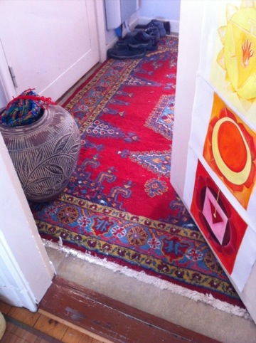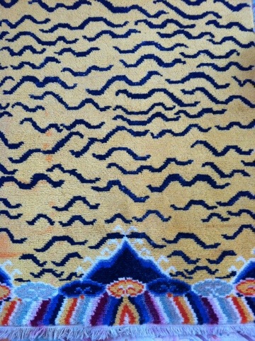 Undviker så mycket jag kan de sk yogamattorna. Dom känns inte hälsosamma. Det är inte så lätt att hitta bra alternativ till alla mjukgjorda plastmattor. Den här mattan brukar jag ta med mej till yogan. Visst är den vacker? Egentligen för fin, men det ska ju användas. Handknuten, i ylle. En Kinesisk tigerfäll. Den sitter jag på och känner mej morsk.