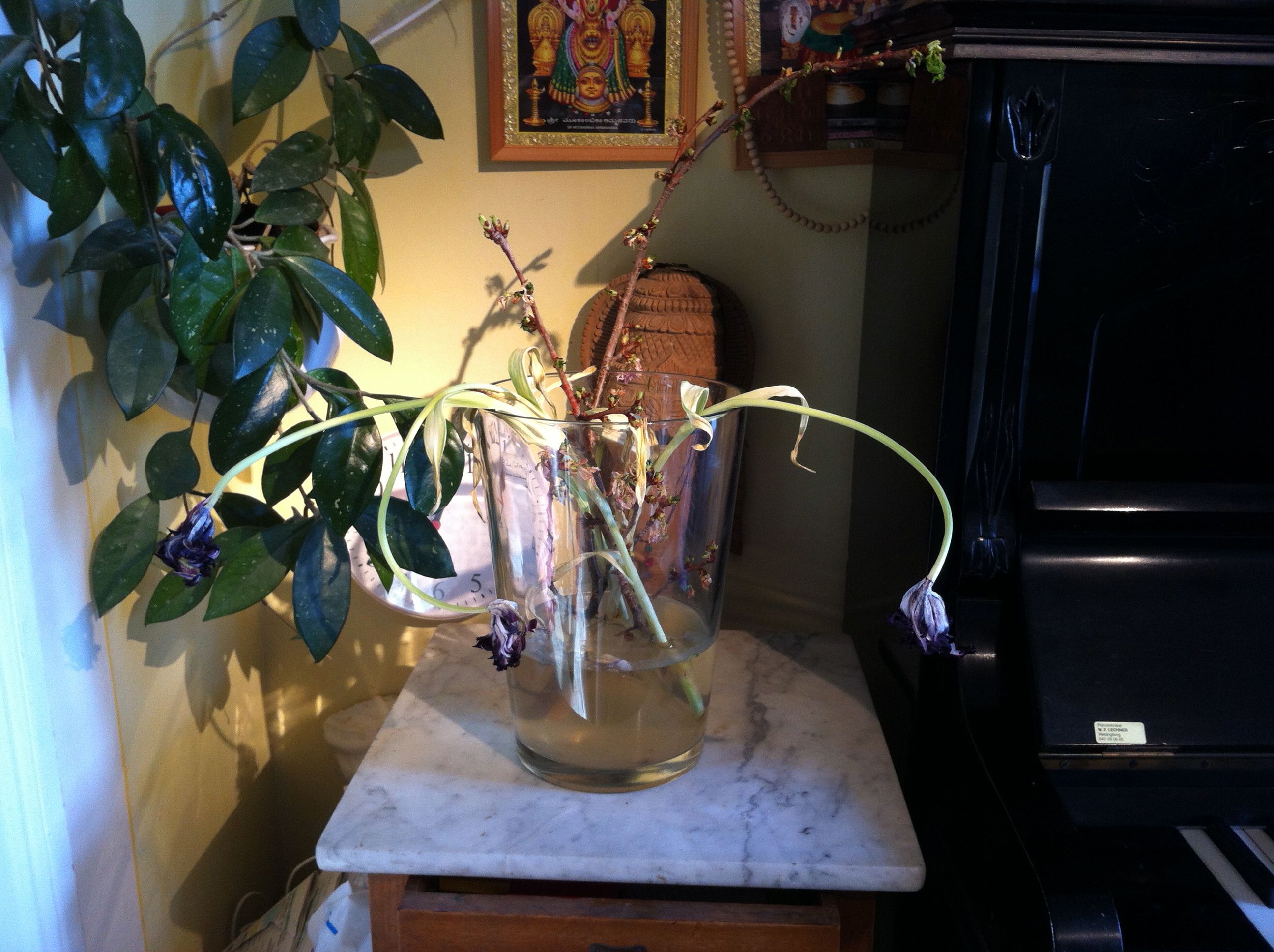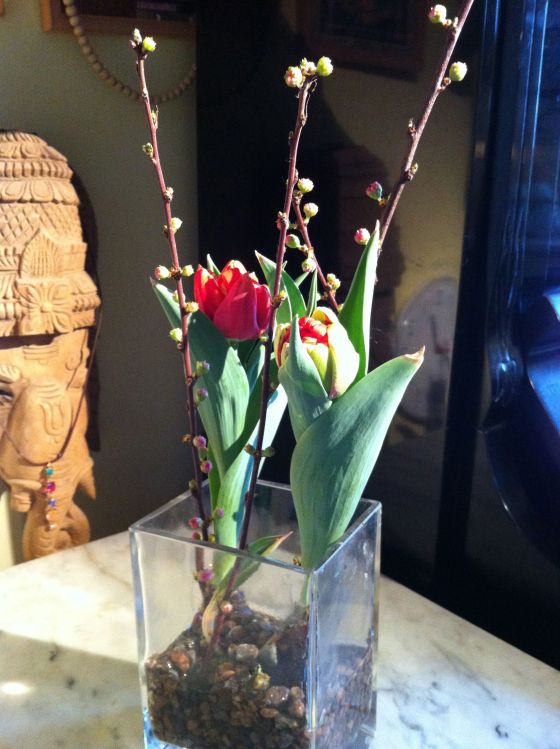 Pusslar med mina blommor, och även om jag var kritisk till mina rosor som tycktes hålla i evighet så njuter jag verkligen av tulpanernas många stadier. Dom här var ett vackert arrangemang jag jag gjorde innan mina 10 -dagars meditation.