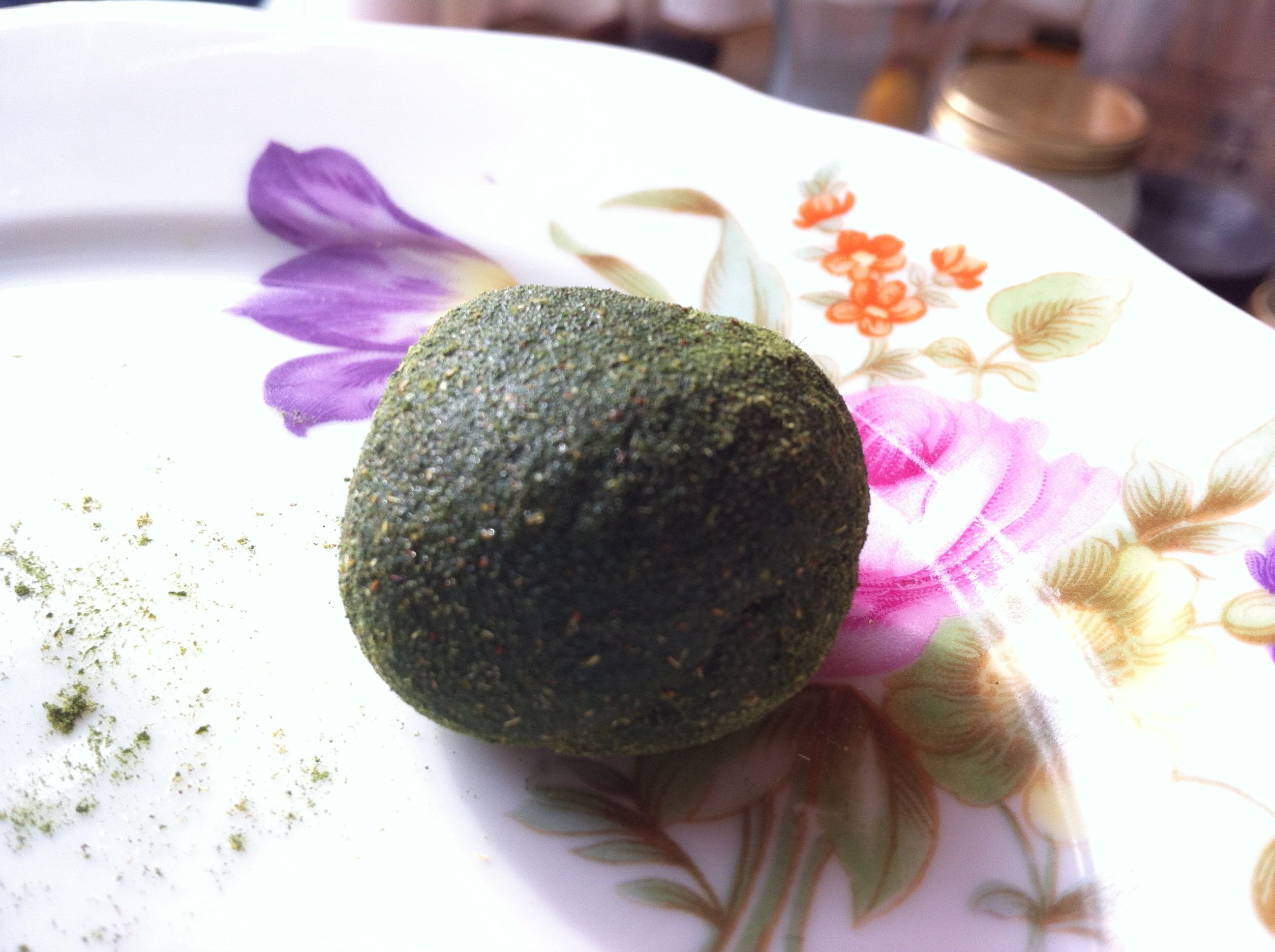 rör ihop vetegräs och lakritsrots pulver och rulla bollarna gröna och fina.
