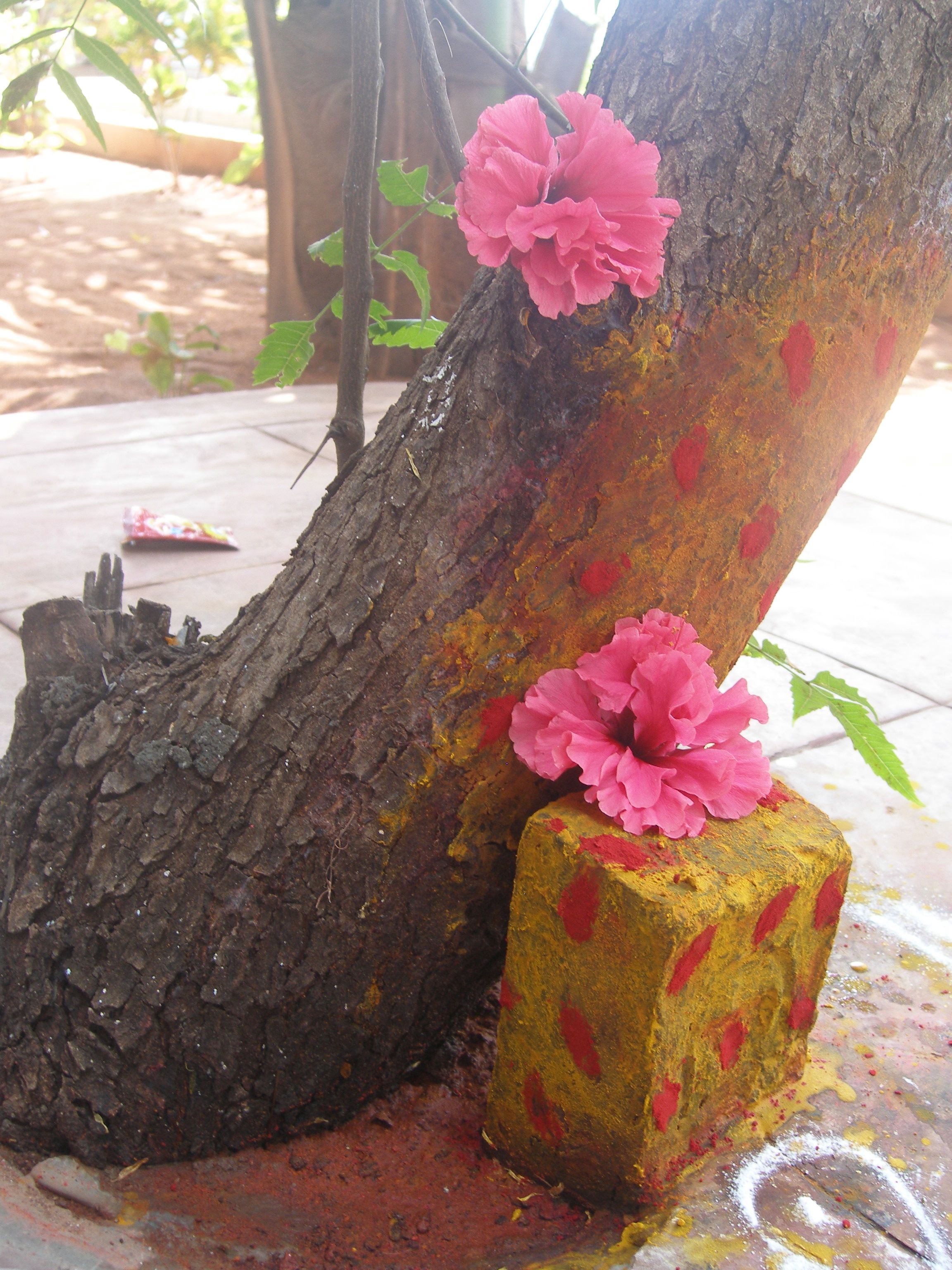 Prickarna på bilden är av vördnad. Mitt i livet, i en trädgård, Tamil Nadu, Indien, har hotellägaren byggt ett altare. Gult med prickar bär på en kraft och intention som är äldre än självaste Hinduismen. Många tusen år med andra ord. En hyllning till allt det vackra inom oss, till den visdom som vilar och bara väntar på att vi ska stanna till och lyssna inåt.