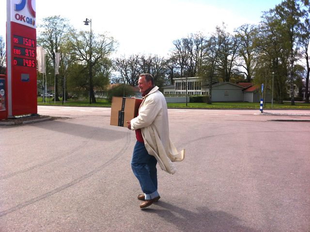 Från Postens utlämningsstation i Vadstena Glider Rurik ut i lagom motvind så att rocken fladdrar. I sin famn bär han ett stort paket.