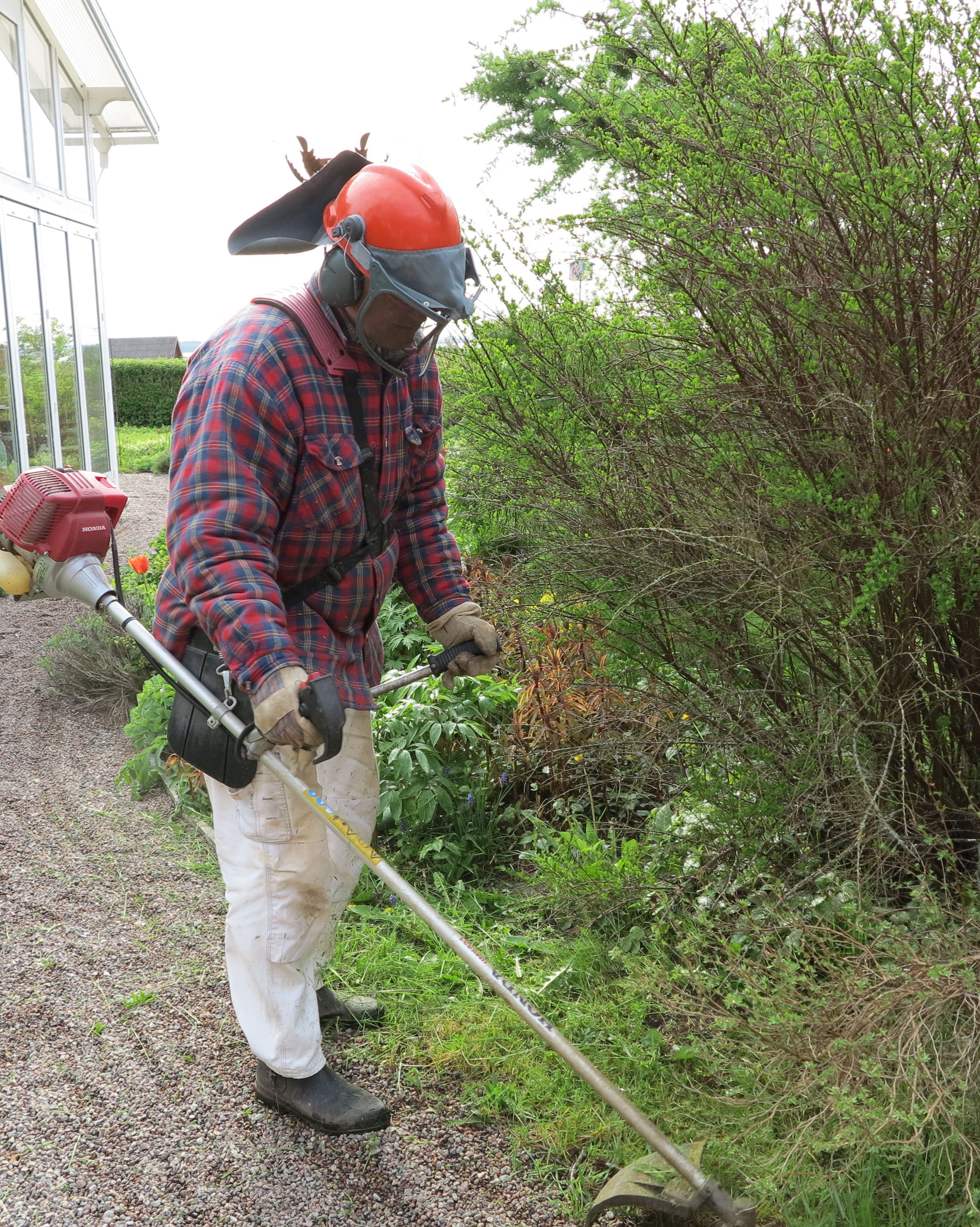 I full stridsutrustning ger sej Rurik i kapp med detaljerna. Det där som gör att det mesta ser bra ut, fast det egentligen är ganska mycket oordning. Nässslorna växer i kapp med det annat nyttigt ogräs – som målla. Trädgården är till för glädje. Jag vägrar ”jobba” i trädgården, den är avkoppling och sinnesro. Vi kommer aldrig att vara med på någon Trädgårdsrunda!