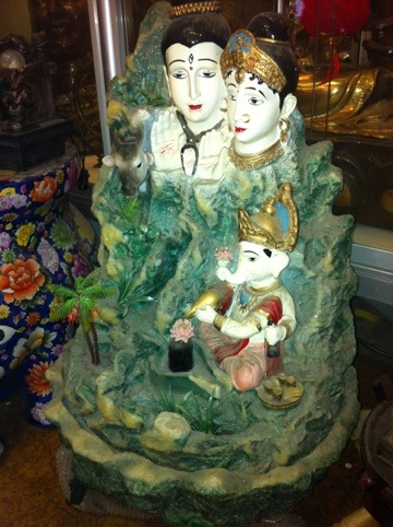 Ett springvatten där vattnet/Ganga sprutar ut ur Shivas hår och rinner ner genom bergen där den heliga kon får dricka, allt medan fru Parvati och sonen Ganesh är glada! Stor är den. Den är så kitchig att man vet inte till sig! Plast palmerna är pricken över i:et.