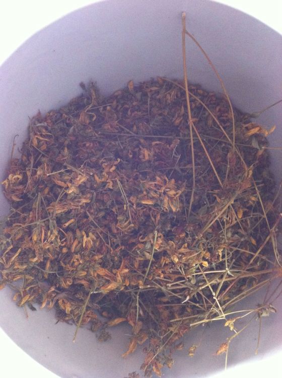 Vi sprider ut den på en handduk och låter det ligga varmt, torrt och utan solljus. Sen trycker vi bara ner det i vår burk. Johannesört är lugnande och lättar på sinnet, den ger en djup färg åt örtte som annars brukar vara svaga i färg.