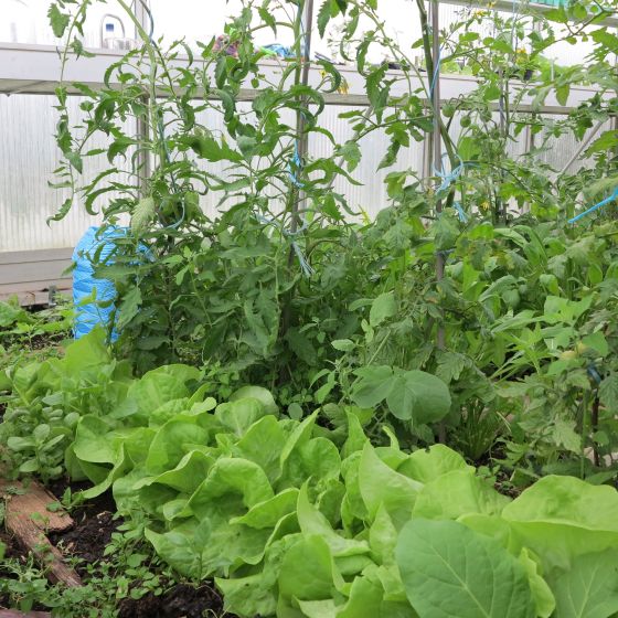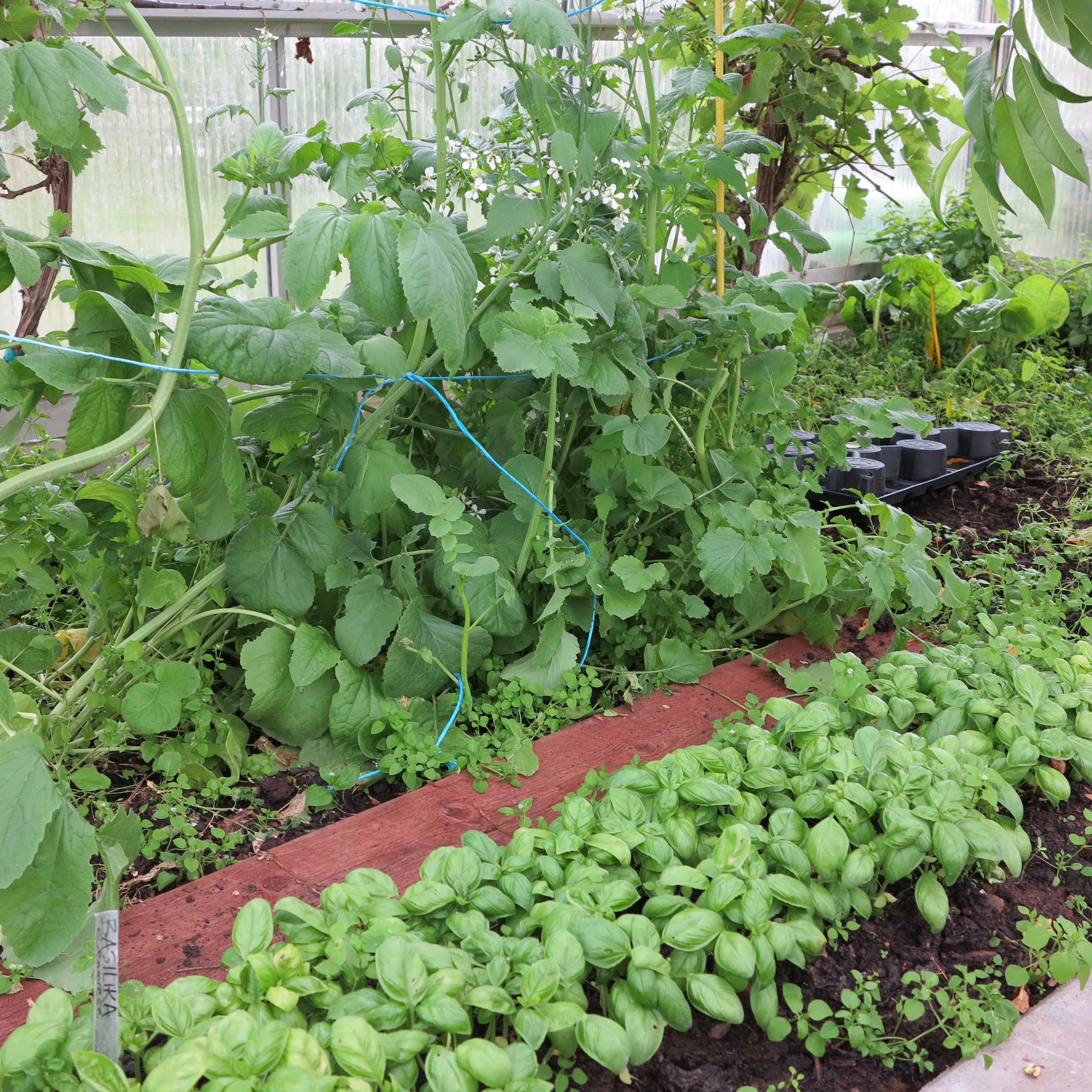en titt in i växthuset, här doftar basilikan. vi har redan njutit av en omgång pesto, gott. Bakom står våra rädisor. Dom ser kanske en aning förvuxna ut?