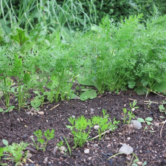 Se här. Den närmsta raden med morötter såddes i vår, så fort det gick, den bortre höga morotsraden såddes i höstas! Rejäl skillnad. Det här gör vi om. Skönt också att slippa så allt på våren. Det är så mycket ändå.