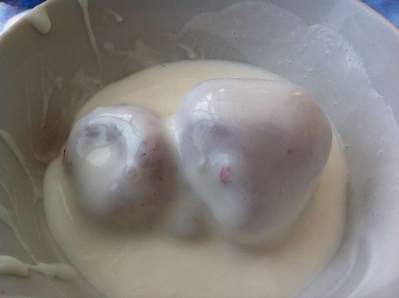 Värm upp grädde och häll i hackad vit choklad – och var inte snål med chokladen! Rör om.