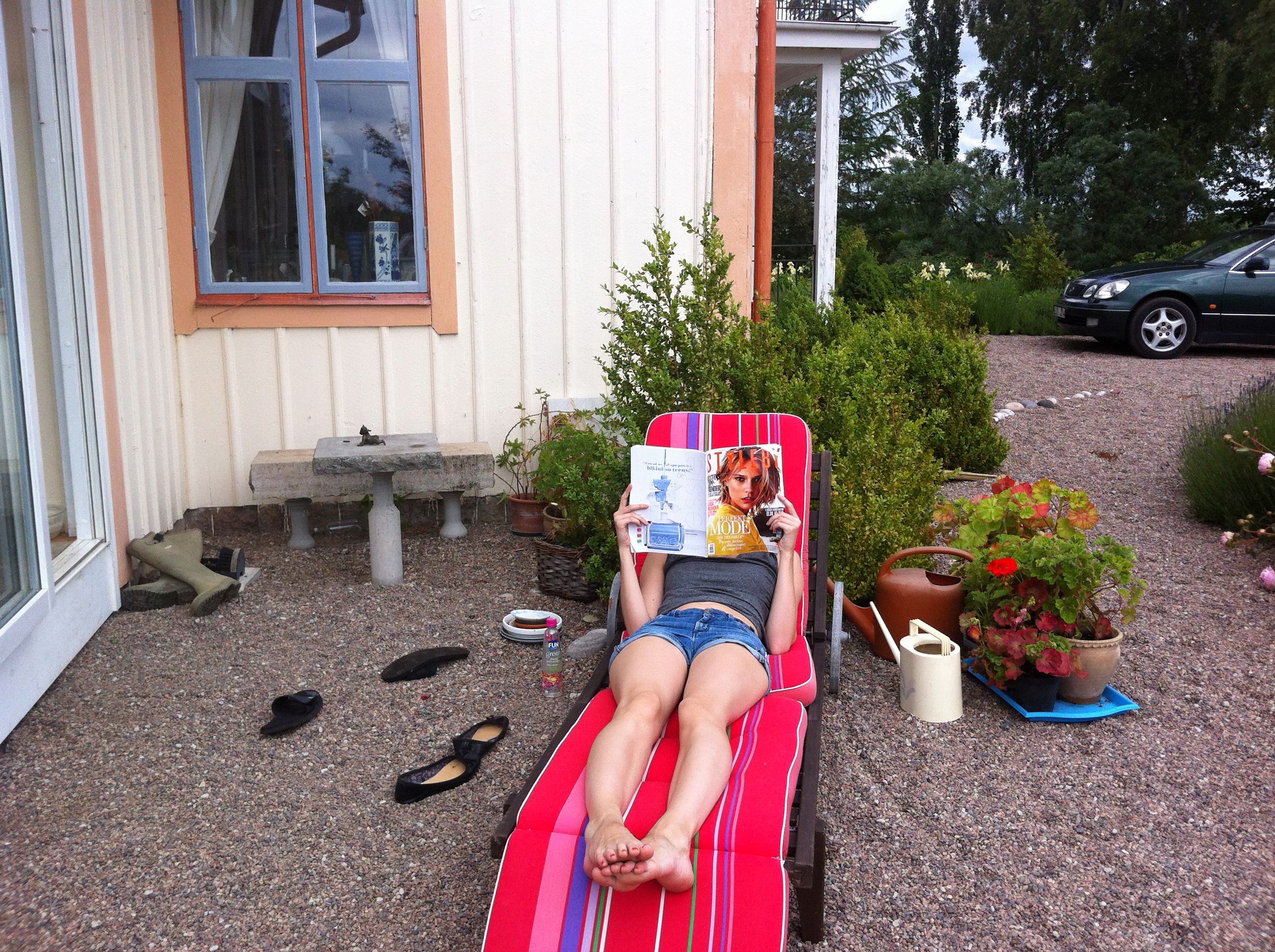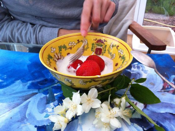 Medan vi mumsade på, påminde vi oss om vårt ”gamla” sätt att högtidligen äta jordgubbar på; Ett stort fat med jordgubbar, häll vanlig kall grädde över, strö på socker, mosa med gaffel…. ät…. det är grymt gott det med.
