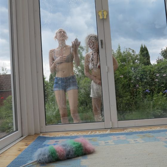Sina barn får man väl muta lite lätt, men åh så mysigt att putsa fönster tillsammans!
