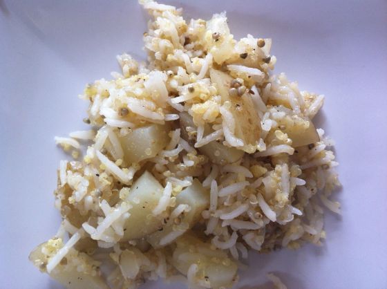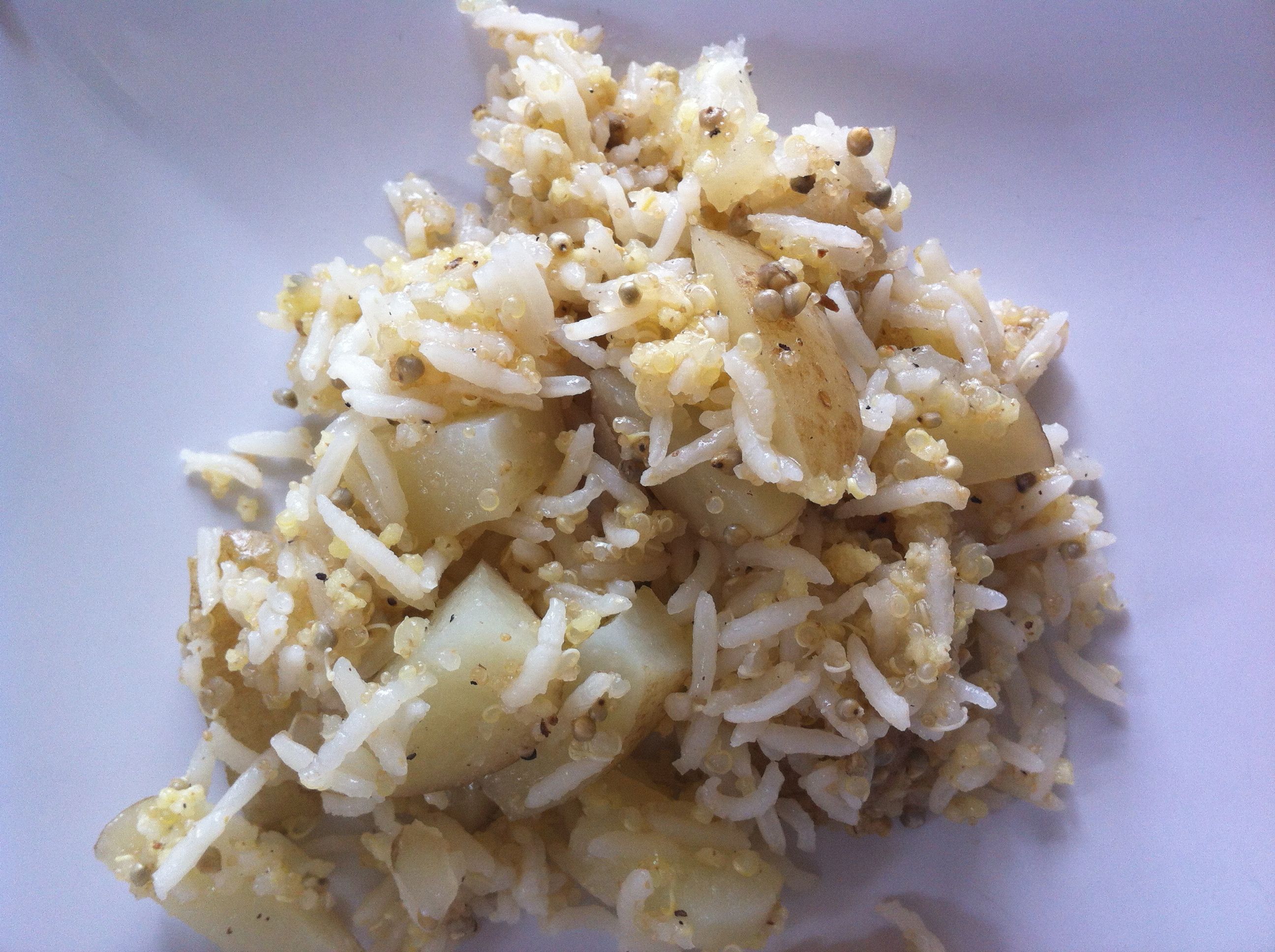 Färsk potatis samsas med amarant, quinoa, hirs och ris. Att koka potatis i bitar tillsammans med ris är en riktig hit, jag lovar. Hirs, quinoa och amarant är ”kraftgryn”. Bovete havre och råg hör också dit, det betyder att de är extra näringsrika – så man kan med fördel äta dem både morgon middag kväll. Det inspirerade oss att stoppa det i middagens ris-gryta.