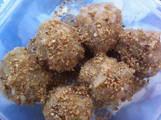 Det här blir det inget recept på. Detta är ett trollerirecept och du trolla med det du har hemma, det kan göras på så många sätt. Egentligen är nog detta Japansk mat. Fast då utgår de bara från kallt kokt ris som de rullar i sesamsaltet….