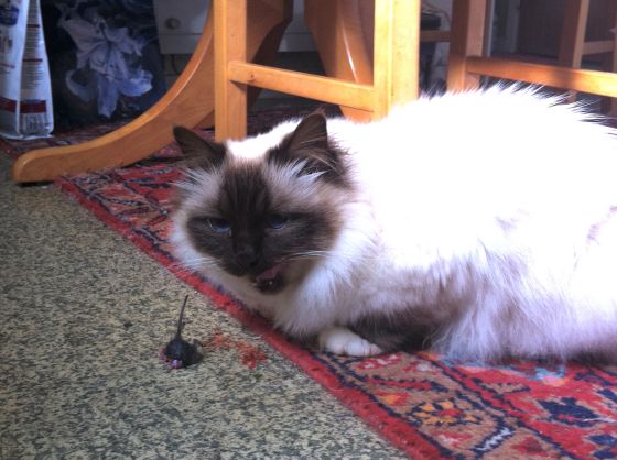 Mem sanningen är ju den att vi är väldigt glada att hon tar möss – och ännu gladare att hon tar sork. dom ställer till mer elände än man kan tro. Så det är så svårt att gräla på henne när hon drar in dom. Det är dessutom ingen ide. Det här är hennes natur. Nu är hon frisk, det betyder att hon går ut och tar sig något litet fast-food, sen går hon lyckligt och lägger sig. Antar att det är höjden av lycka att ta in dom och sitta på mjuka mattan när man åter sin godbit!