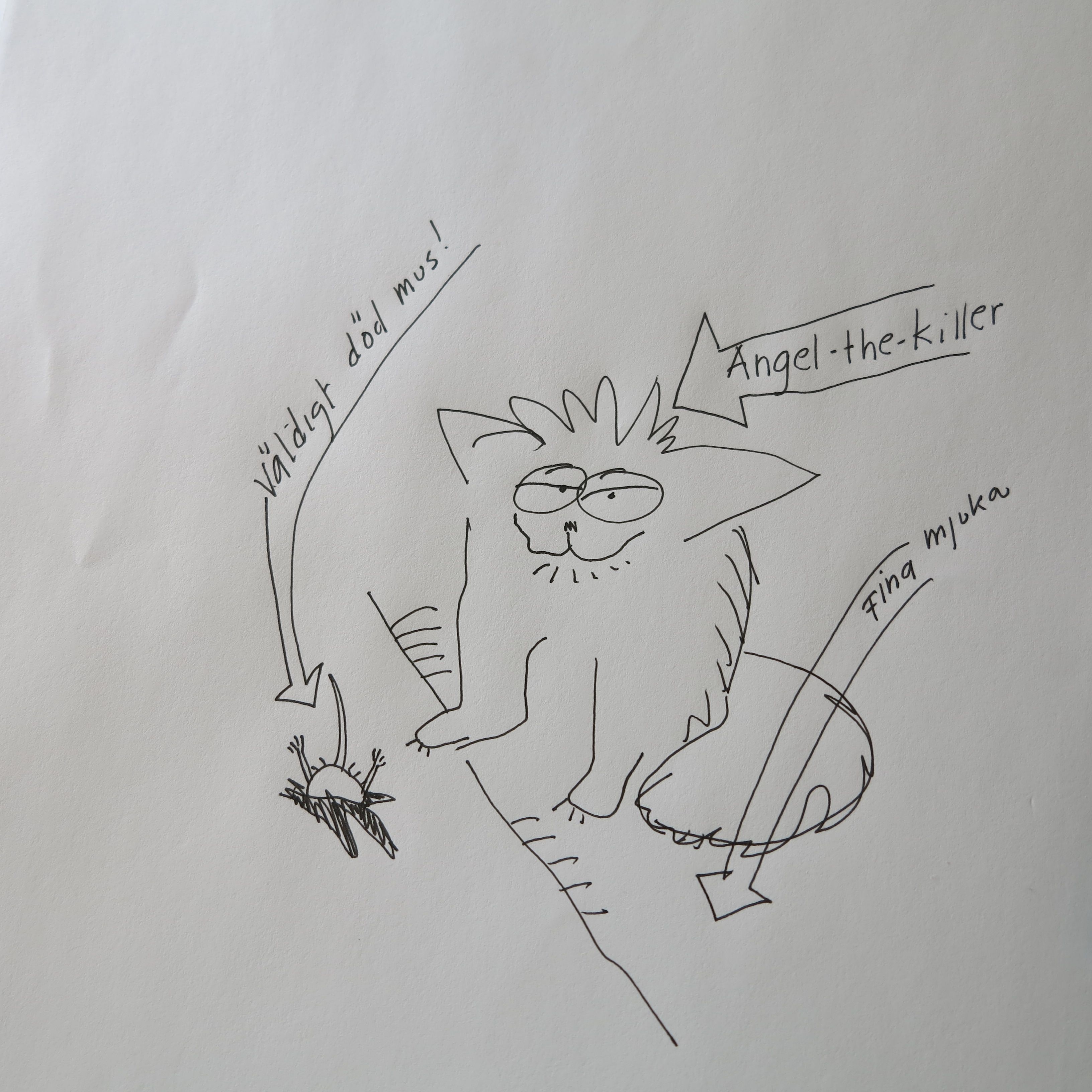 Angel är frisk!!  Hon drog upp Rurik tidigt imorse, för nu hade hon fångat en mus. Visst ville Rurik vara med och leka? Fint med indragna klor bollade hon stackaren fram och tillbaka. Så här är det när man har kattlucka. Inte alltid kul. Rurik bar ut musen, han var inte leksugen, musen kilade iväg och kvar i köket gick en förvirrad katt…