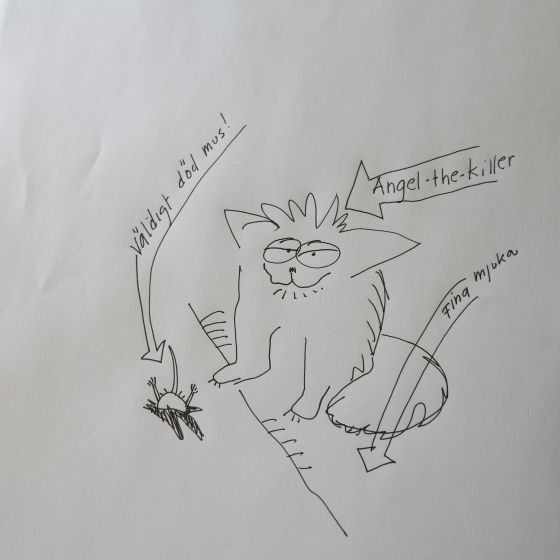 Nu är det musfälla fram. Vi har erfarenhet, vi vet, ibland tappar hon plötsligt intresset för bytet. En gång möblerade vi om hela vardagsrummet för att få tag i en mus som hon släppt och av någon anledning tappat intresse för.  – och förra vintern upptäckte vi  att två förrymda möss hade hittat varandra! Tycke uppstod och de hann  bli 17 stycken (sjutton!!) innan vi hittade dom under trappan och fick fångat dom. Då var hon inte mycket till jägare. Det var vi som fick ta dom med fällan!