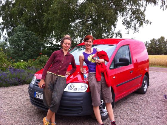 Ja! vi har fått besök. Av en röd bil med badkar i lasten. Två tuffa brudar där fram.