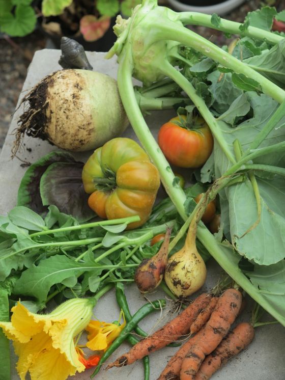 Det är kålrot och rabbi, morötter, sallader, lök, krasseblommor, tomater…… ja, jag har ju lite ögon för det som jag är sugen på, så nu får jag prata för min sak.