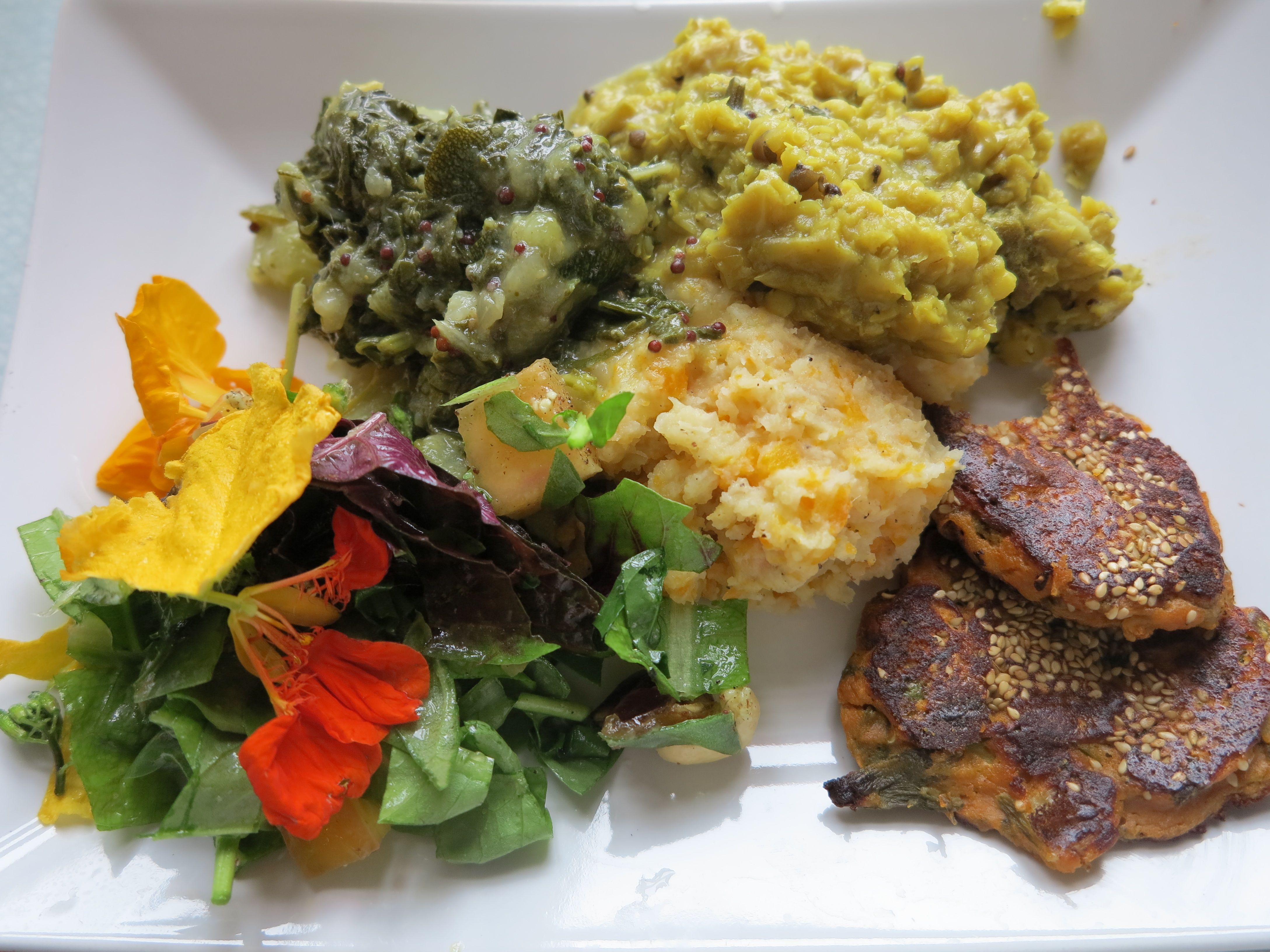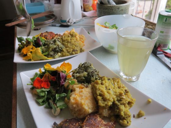 Trolleri. Det som nyss växte i grönsakslandet, är nu på väg in för landning i våra magar. Sallad med blommor och nötter, grönröra, böngryta (dhal) rotmos och plättar (av kikärtsmjöl) med gårdagens rester.