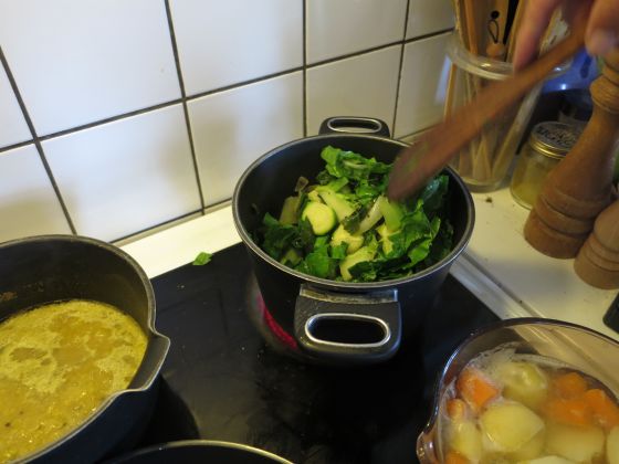 Eftersom det idag kom in en kålrot, så blir det mos, så bitar av potatis, kålrot och morötter kokas tillsammans. Det händer mycket på spisen, jag håller mig undan.