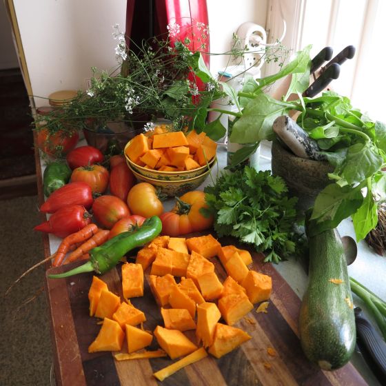 Kolla vår köksbänk! Den är invaderad av godsaker. Det kommer från våra odlingar alltihopa!