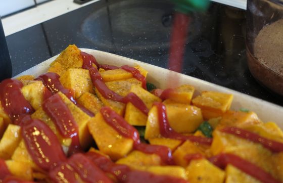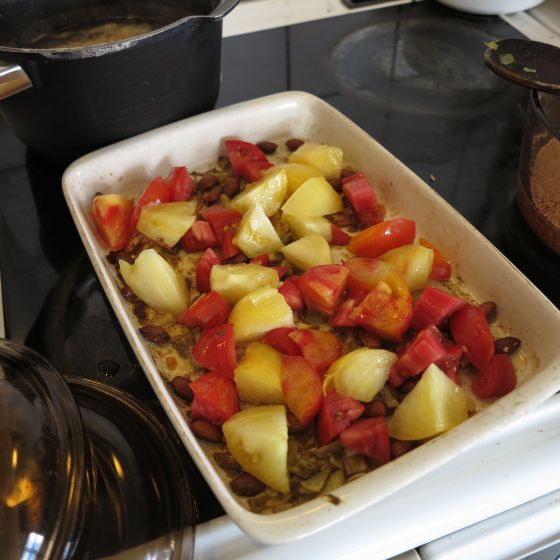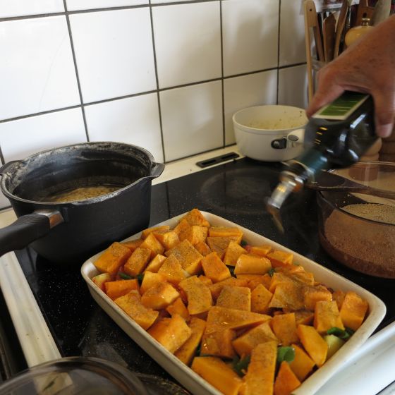 Bitar av tomat och pumpa. Mer kryddor. och ringlad olivolja…