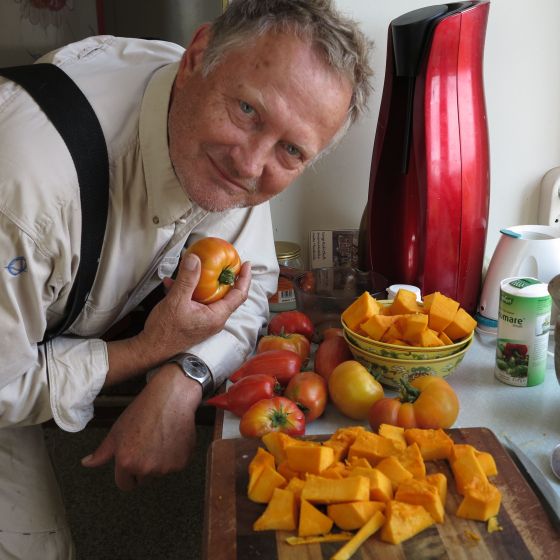 Kökskonstnärens beslut blir att satsa på rött och orange. Dvs pumpa ( ja, vi har fortfarande kvar av våra pumpor från förra året – och dom är godare än någonsin!) och tomat. Resten av middagen får underordna sig.