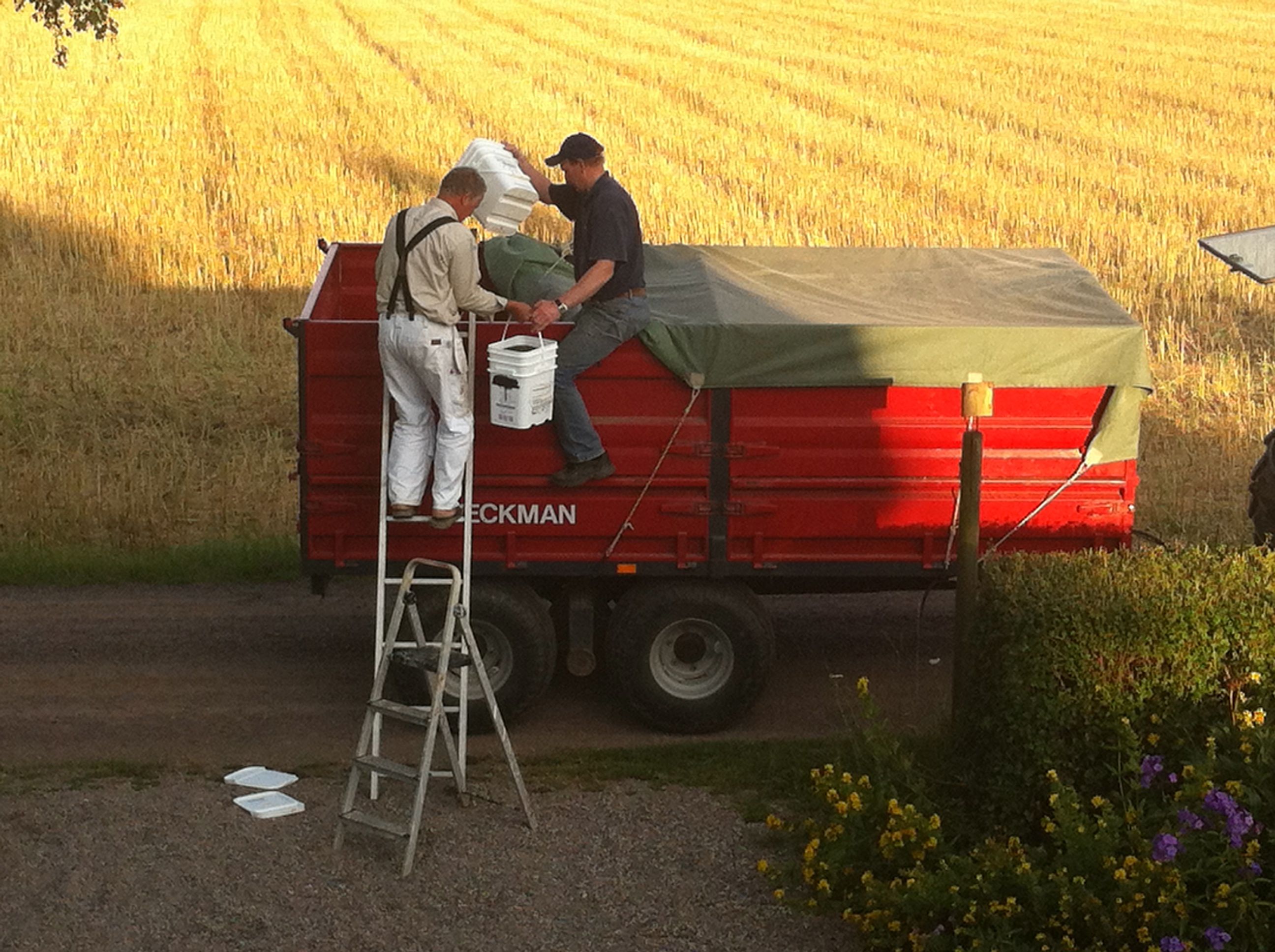 Rurik frågar om vi kan få köpa lite … Tomas stannar snällt när han kör förbi med vagnen full av raps.