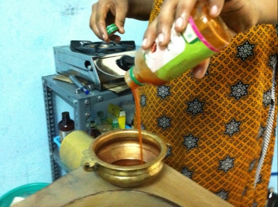 Dags för behandling. Först en olja med örter att masseras in.