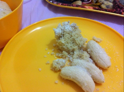 Så monteras röret med ris och kokos på tryckkokaren. Tryckkokaren går för jämnan. Morgon, middag och kväll. 10 minuter räcker för det här tubriset sen är det klart. Serveras med banan o socker.