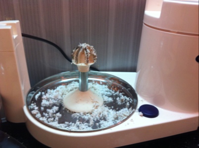 Det varvas med nyriven kokos. Då visar den unga frun upp den nyinköpta hushållsassistenten som naturligtvis även är en kokosrivare!