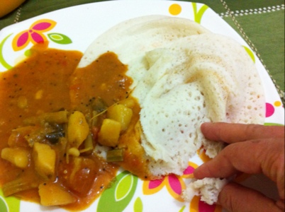 Min favorit bland alla varianter på ris, här i ris-himmelriket, är nog Appam. En rispannkaka som är härligt seg och lite frasig. Två timmar får ris och splittad mungdhal ligga i blöt, sen kör de allt i mixern (som också jobbar stenhårt jämt). Sen har de något i Indien som vi inte har… Varmt och ris-jäst svampar som bara finns, överallt, eftersom alla lagar sådan här mat. Så de bara låter det jäsa naturligt över natten, tillsätter salt och steker…