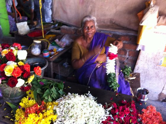 Blomsterkvinnan binder girlangen medan vi väntar. Det tar inte lång tid. de vita blommorna är jasmin, de doftar bedövande, hon lägger in några rosor och lite blad mot kanterna.