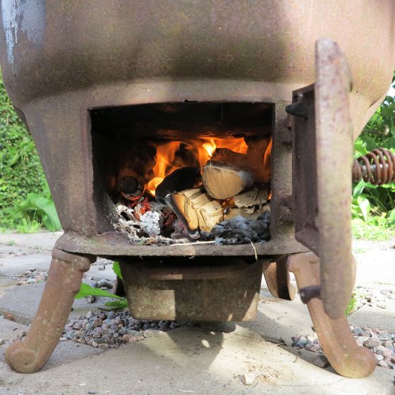 Vi eldar i det gamla tvättkaret som står i trädgården.