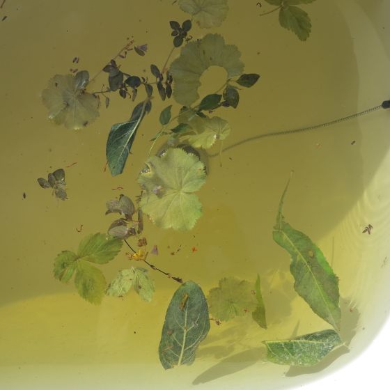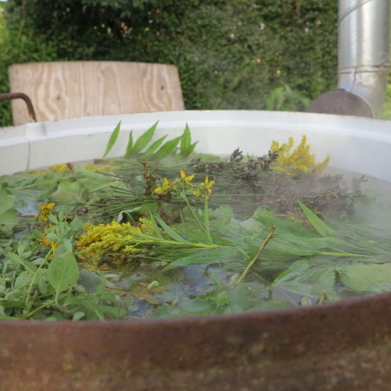 Generöst lägger han på med örter i badet. Det blir daggkåpa, lavendel, oregano, johannesört, smultron och gullris.