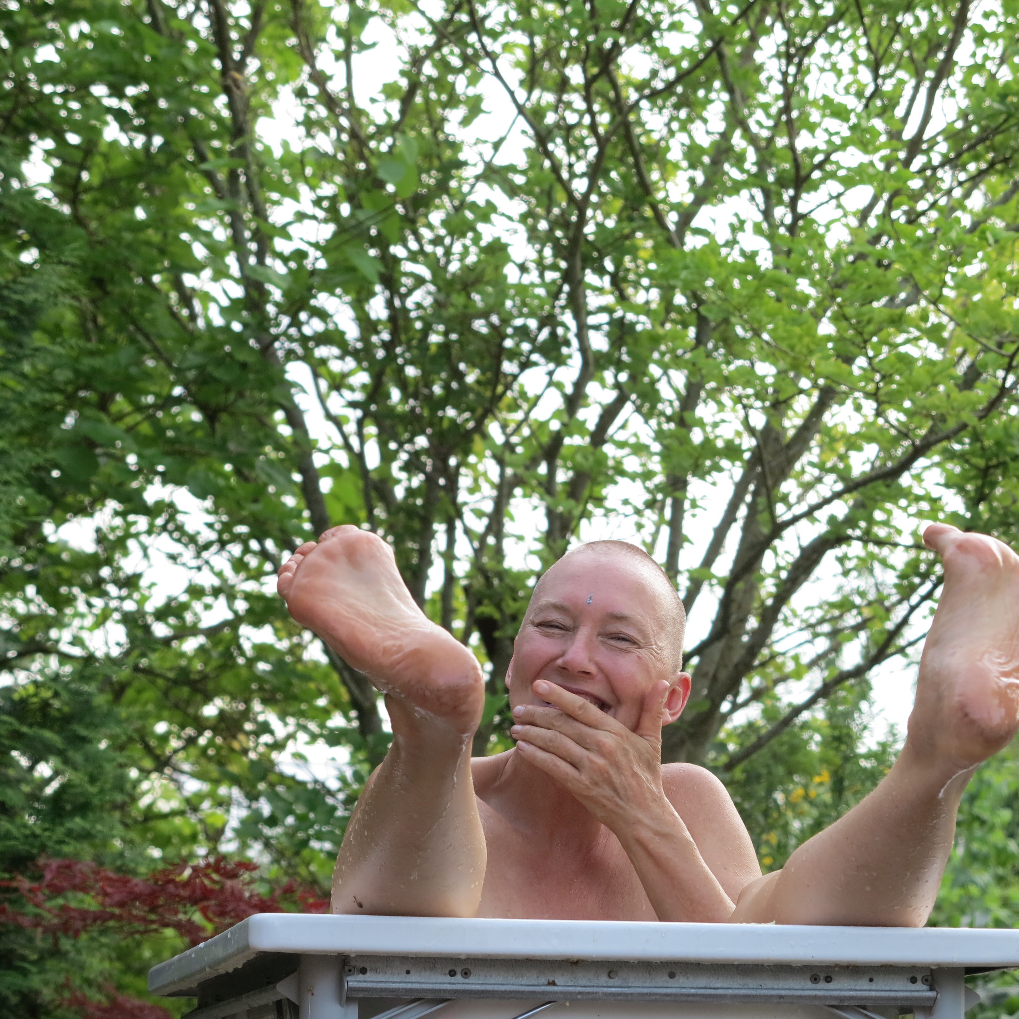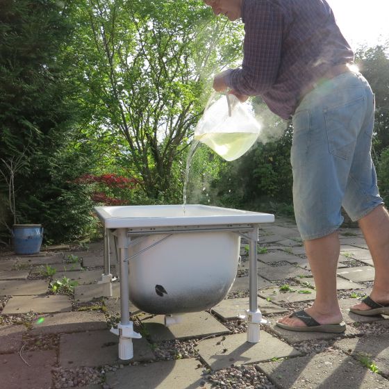 Vi har fått ett alldeles lagom litet badkar, som passar vårt lilla hus. Men idag inviger vi det i vårt stora utomhus badrum.