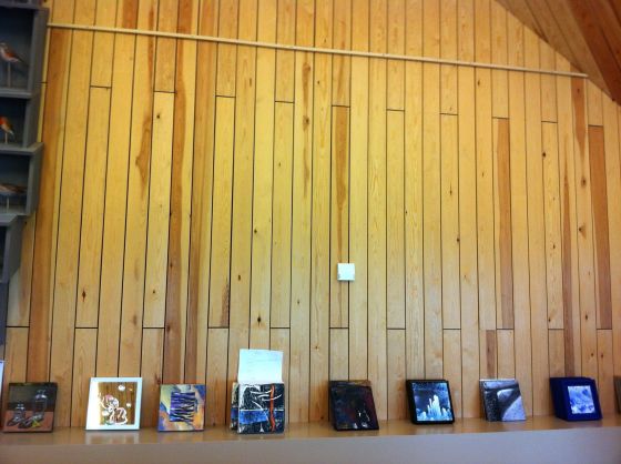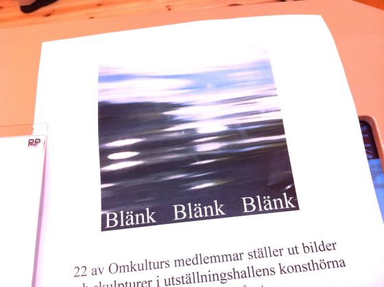 Fast idag får du bara se den väggen. Det rinner vatten, sådant väder har vi. Regn som vanligt. Vi ska gå in för idag är det hängning av Omkulturs gemensamma utställning ”Blänk”, en utställning med anspelning om vatten.