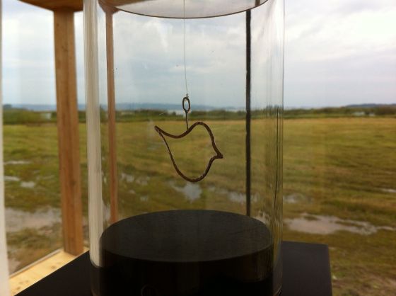 ”den är inte klar än” säger Stig, silversmed. ” det ska ligga mynt under fågeln, den heter; jag ska köpa vingar för pengarna” Vi skrattar. sen tar jag en bild i alla fall, fast den inte är klar. Den är fin så här med, med hela utsikten av Tåkern bakom sig.