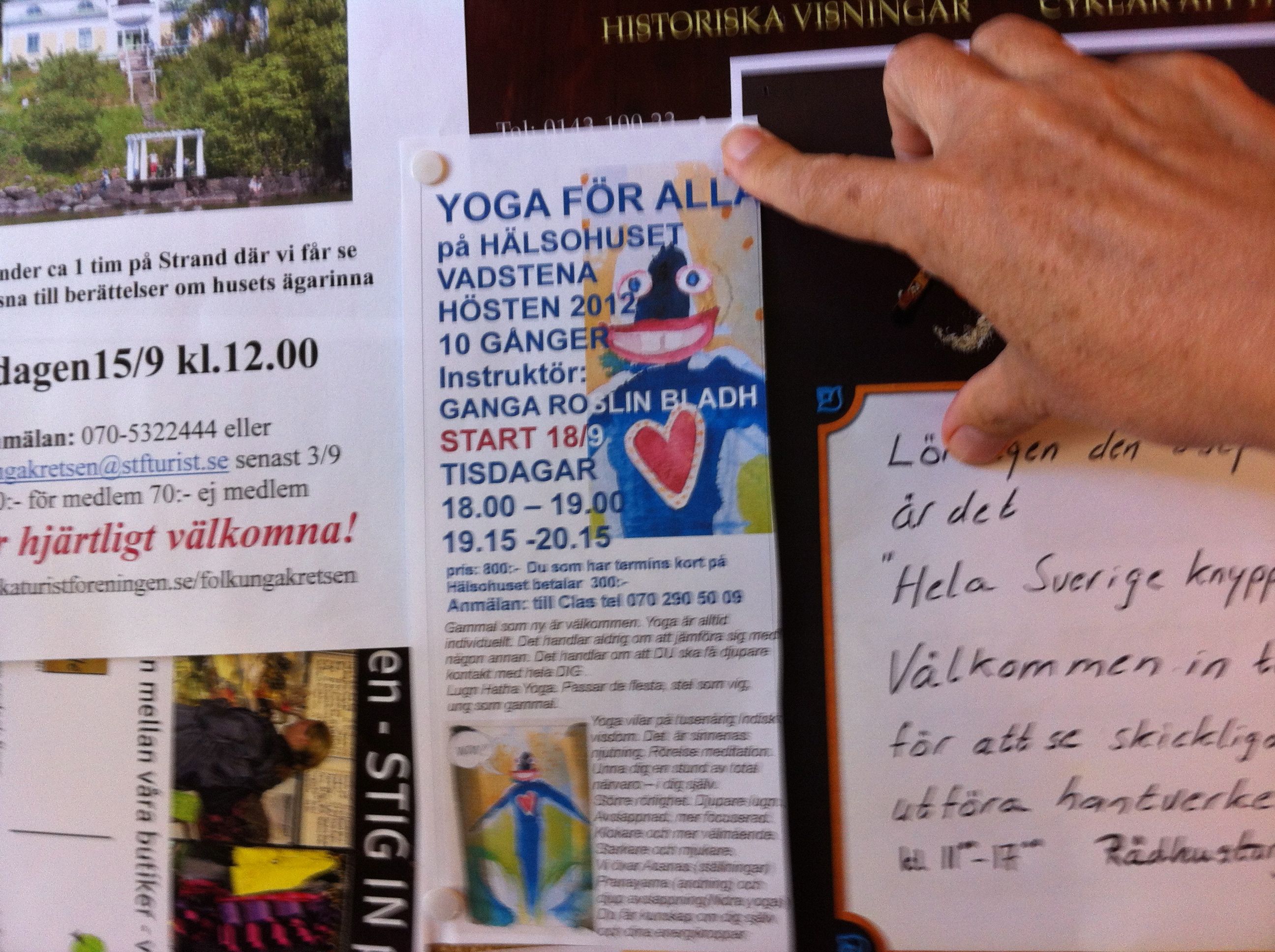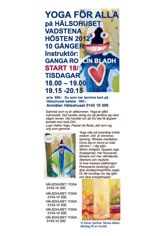 lappar på anslagstavlorna i Vadstena. Nu börjar snart höstens YOGA! Jag har hållit Yoga i Vadstena i, hm, jag minns inte, men länge är det. Sju terminer tror jag. Det var en utmaning när jag började. ”Yoga för alla”…. även för skadade nackar, för nya som gamla o stela. Men det har varit bra, för det har hjälpt mig att förstå vad yogan verkligen handlar om. Jag har haft deltagare som legat stilla större delen av passet. För att de äntligen lyssnade till kroppen – och den ville vara stilla. Fast det är kanske lite extremt, vi använder andning, ställningar och djup avslappning och känslan efteråt är lika härlig som när man äntligen får duscha efter att varit smutsig i flera dagar. Man blir liksom ”ren”.
