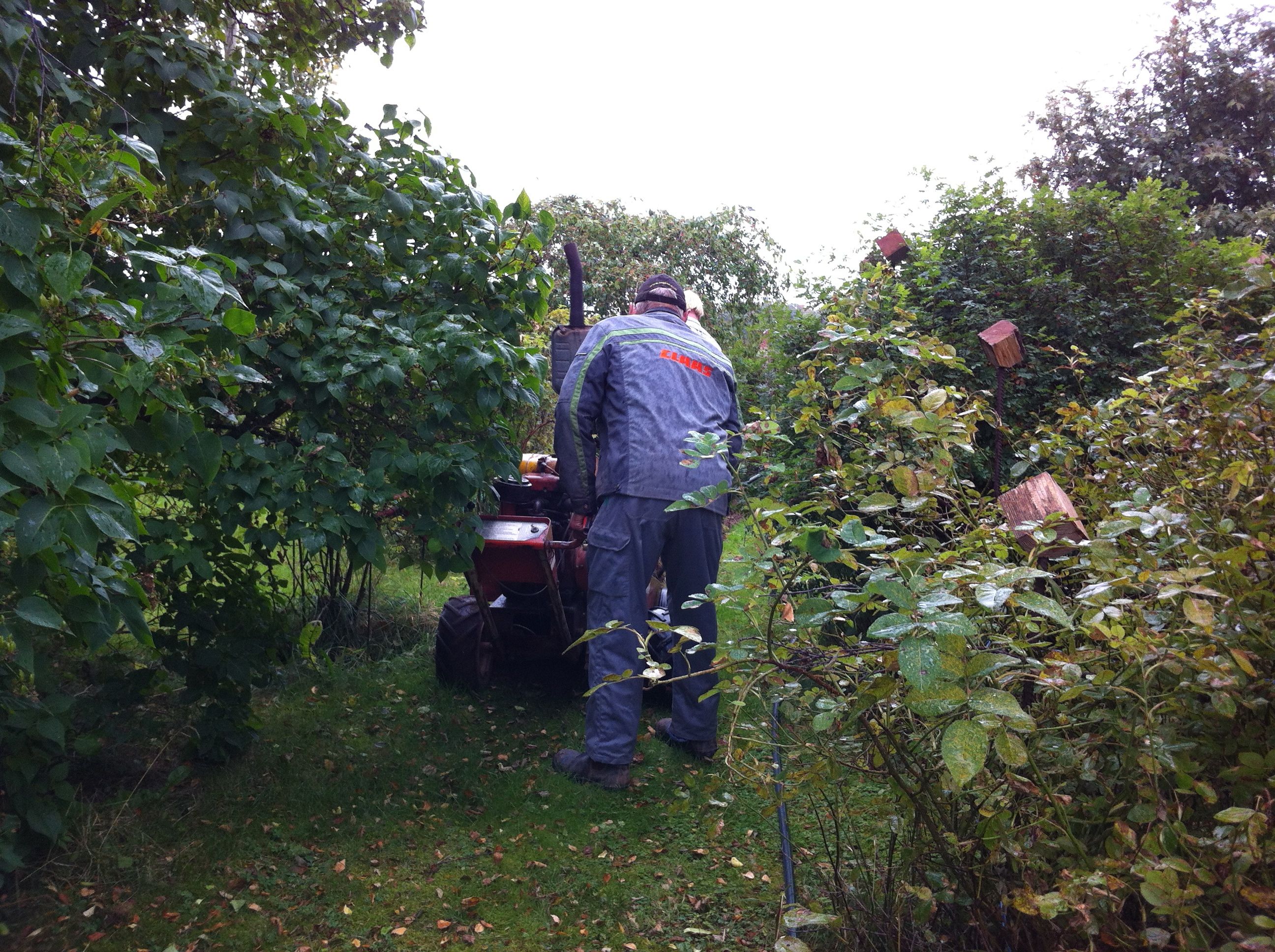 Då, förra hösten  var detta årets grödor redan sådda. Så vi har hållit oss lugna ända tills nu. Man vill hålla sig väl med grannarna.  Det är ett tungt grävjobb.Traktorn drar grävaren.