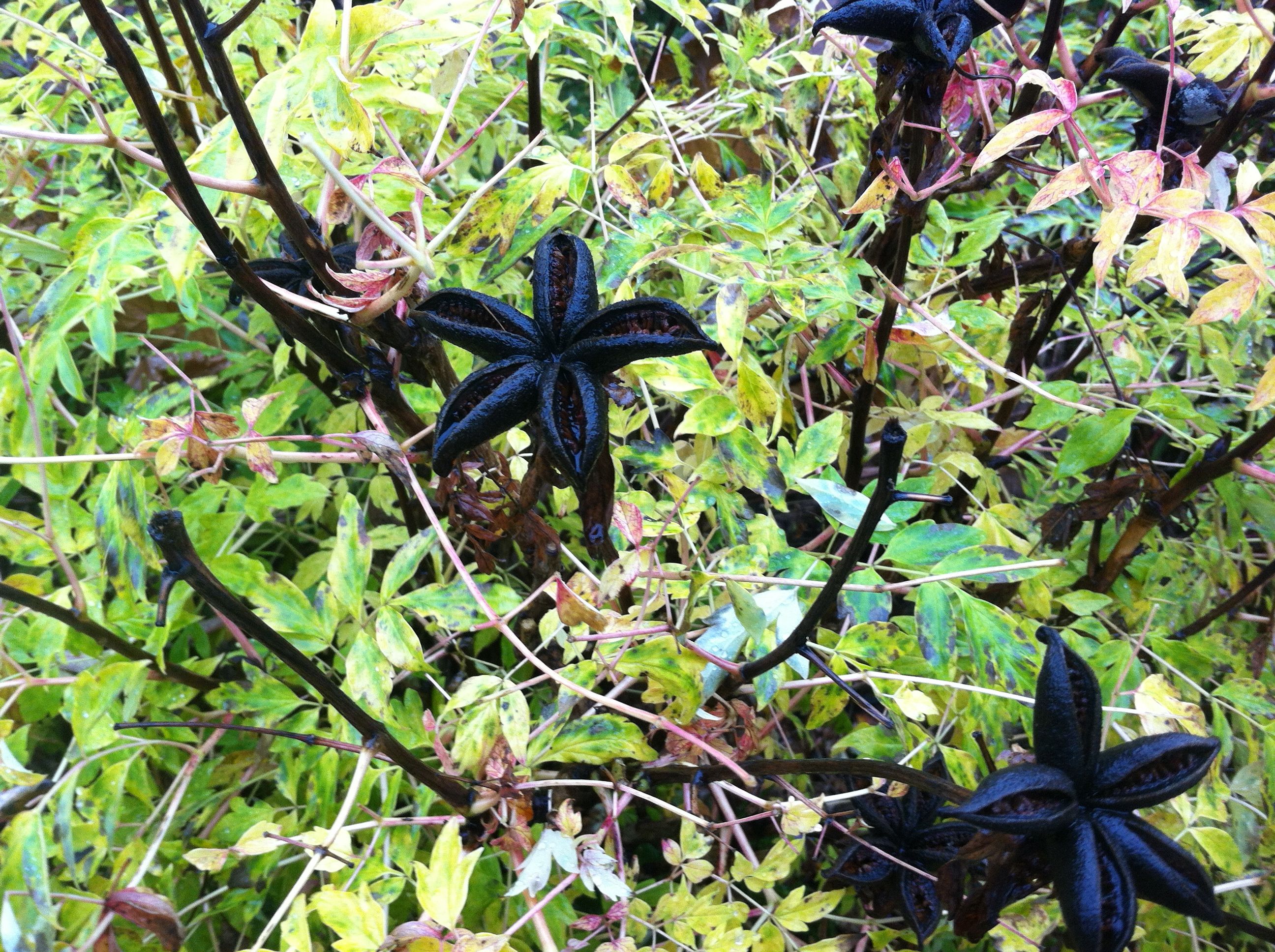 Den kinesiska buskpionen är hypnotiserande ända in till slutet. – är det svarta blommor? Frökapslarna tittar tyst på mig.