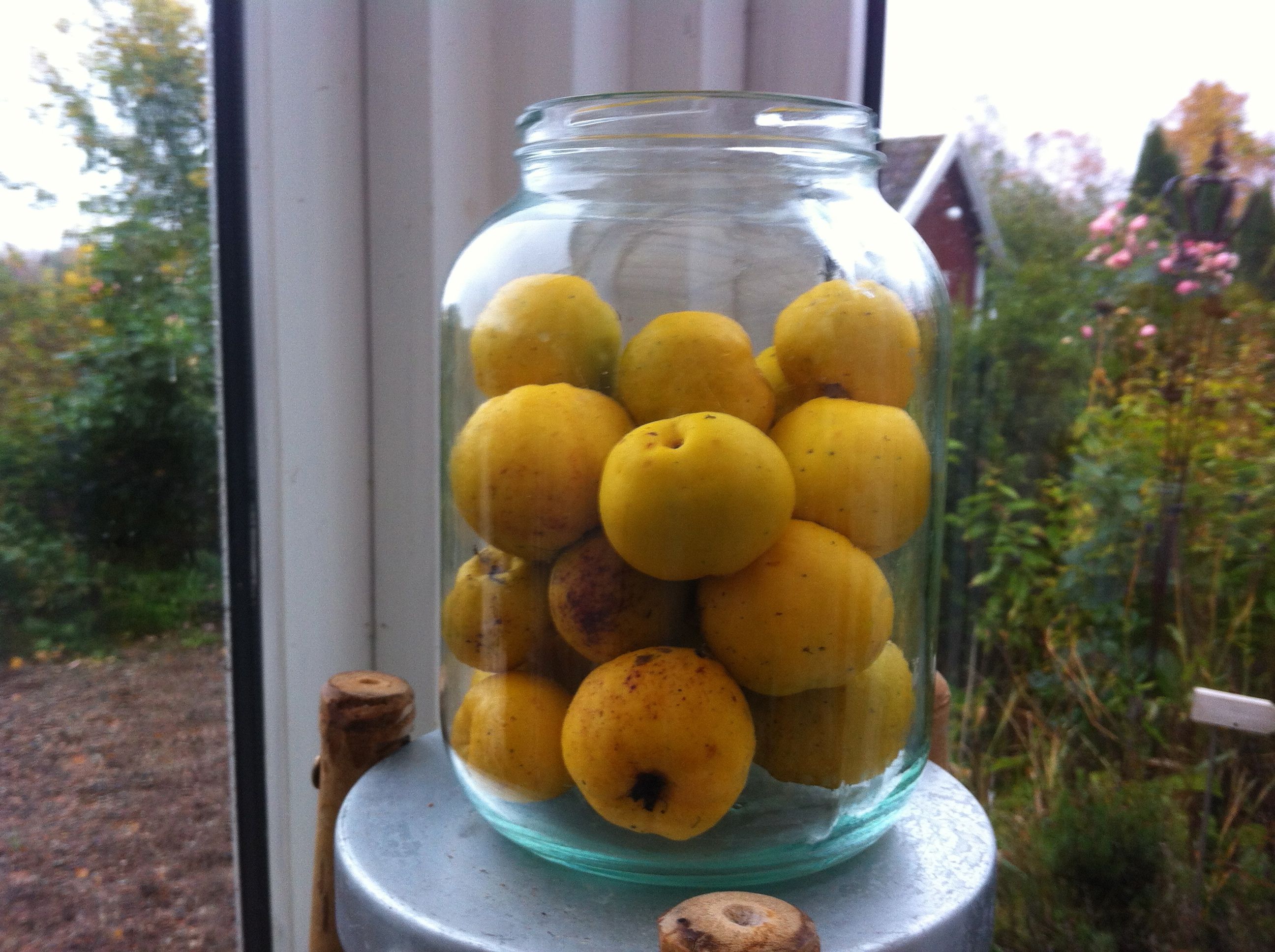De är märkligt lika äpplen, men de kommer från en taggig buske. Vi läser i en husmorsbok från förr, att de behåller doften och att man brukade lägga in ett kvitten i glinneförrådet, eller i en skål i rummet för att få luften uppfriskad. Den ruttnar inte som äpplen gör då de ligger för länge, utan de lär helt enkelt skrumpna in. Det här måste vi helt enkelt prova! Det kommer att ligga kvitten både här och där i vårt hus denna vinter!