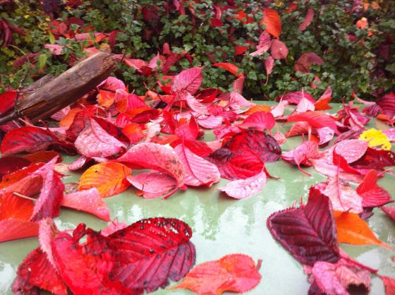 Men löven skriker, sjunger och tycks inte alls lida av den pågående nedbrytningsprocessen. Mycket av sommarens blommor reser sina frökapslar, mörka och ståtliga.