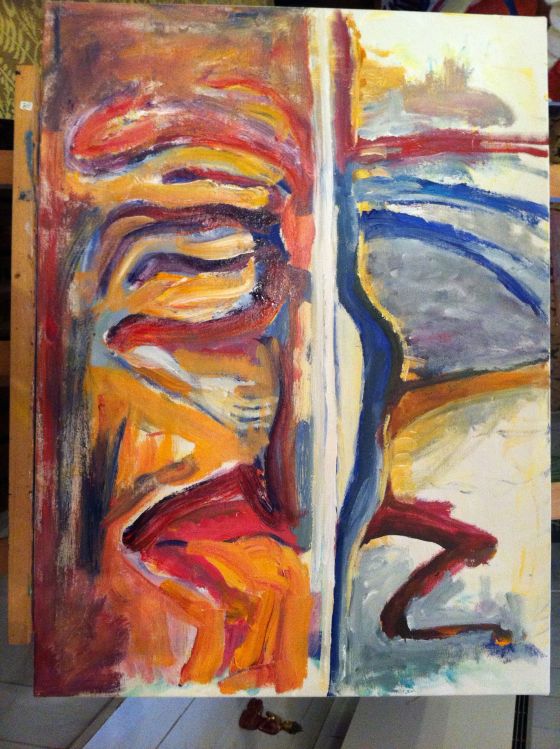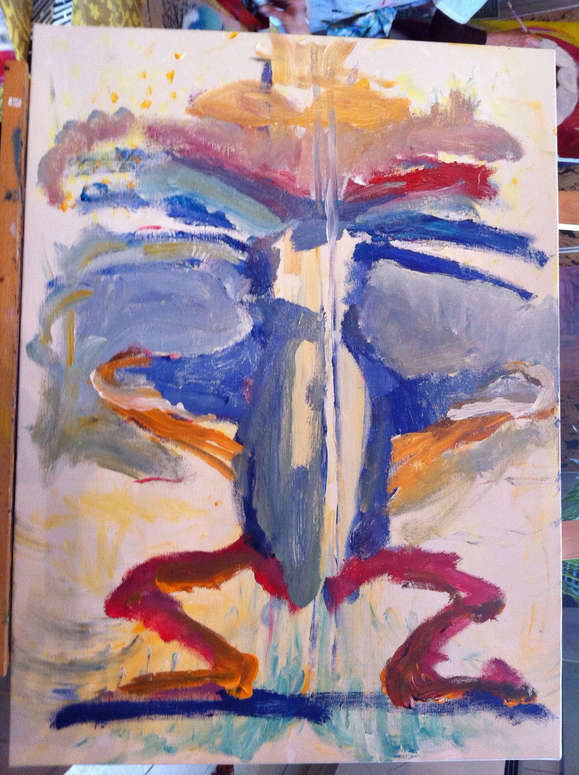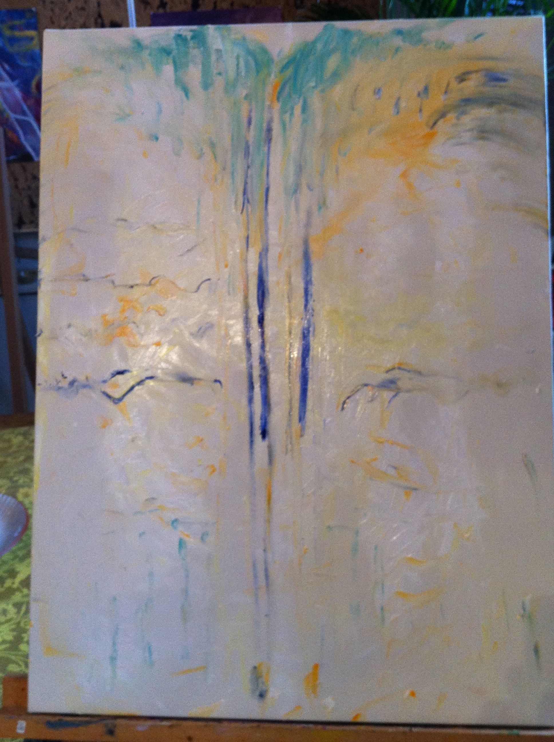 Jag njuter mycket av att bara måla på, snurrar på bilden emellanåt. Det blev en slags mittlinje genom  bilden som jag behöll.