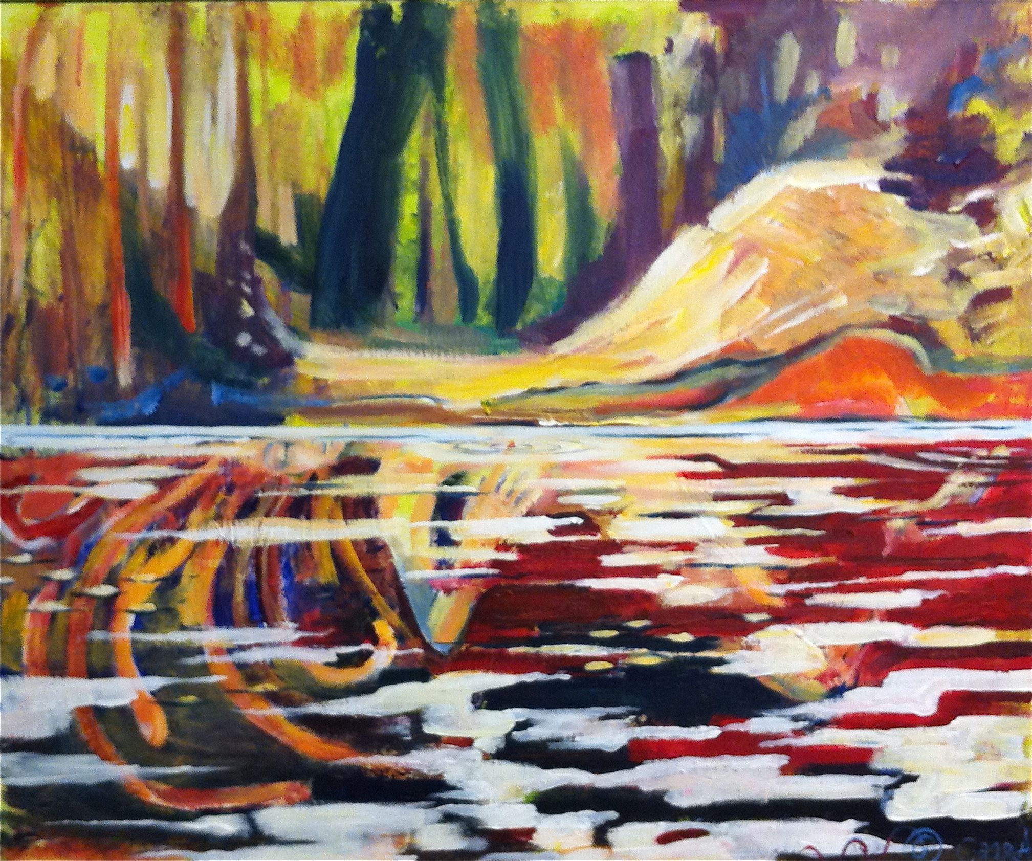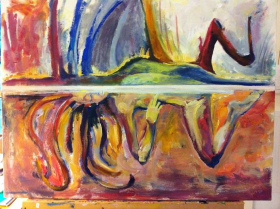 ett landskap…. men formerna i landskapen speglas…. och blir till en kvinna. WOW, när jag förstod, var det som mitt hjärta expanderade.  Jorden, vattnet tog formen av en kvinna – en gudinna. Slumrande.Nu har jag och tavlan en dialog! Jag lyssnar.