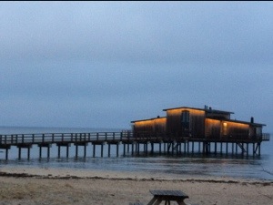 Helt underbart. Nymornad går Jenny iväg med mig till kallbadhuset. Genom ett stilla vinter-Båstad når vi stranden.